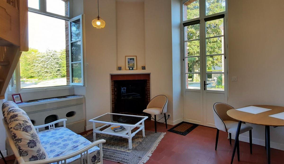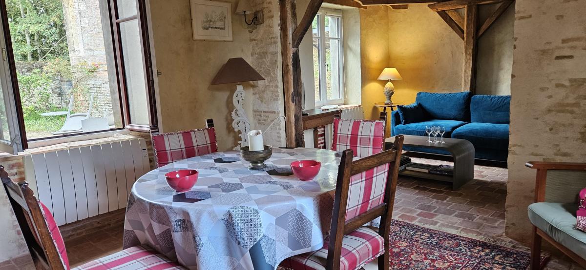 Cette maison, ancien commun du château, donne dans la jolie cour pavée du pigeonnier, elle dispose d'1 salon avec un canapé lit pour 2 personnes d' une salle à manger et d'une cuisine équipée, une salle de bain (douche) et toilettes au RDC
