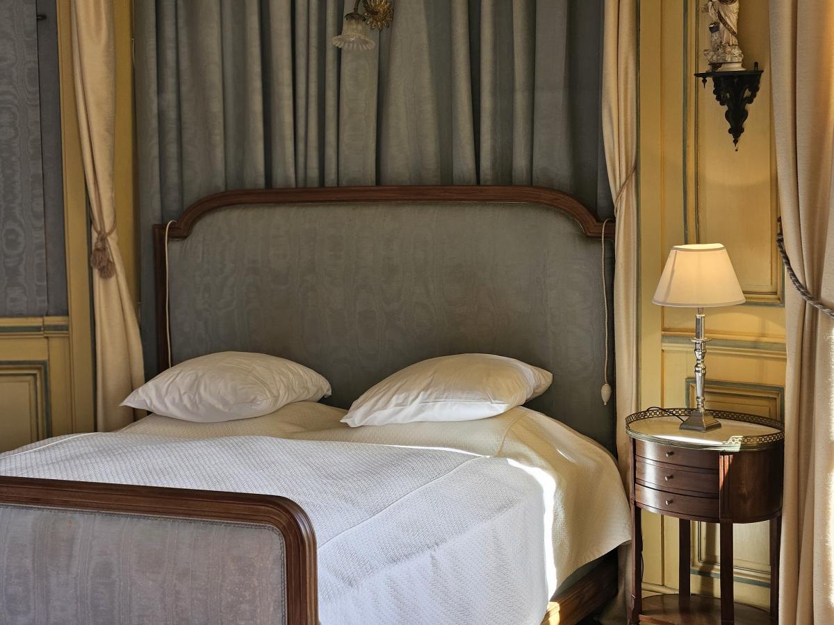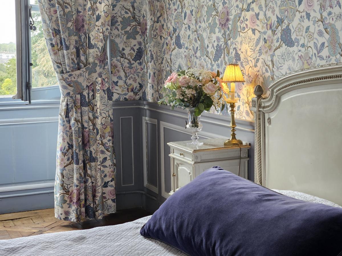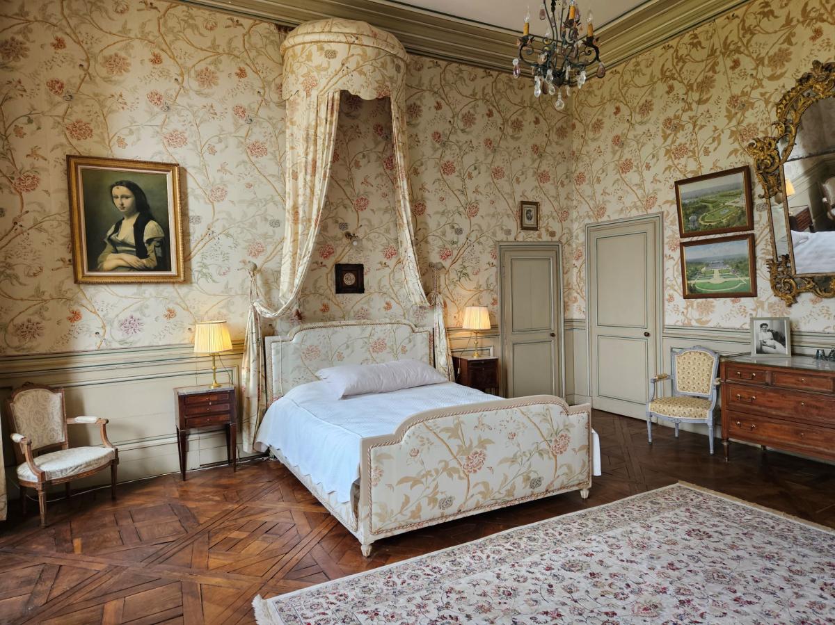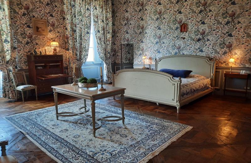 La chambre bleue est sans doute l'une des plus belles chambres du château. située au centre du château, ses fenêtres ouvrent sur la grande perspective du jardin à la française.