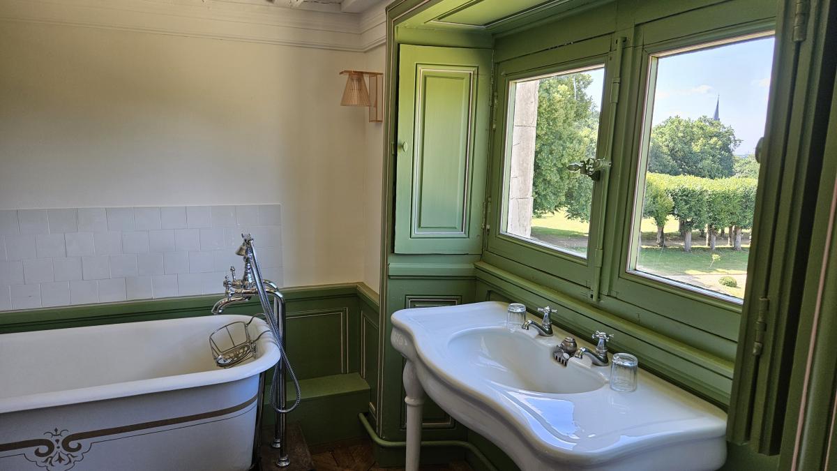 Salle de bain avec douche et baignoire vasque ancienne donnant sur le jardin à la française, toilettes séparés.