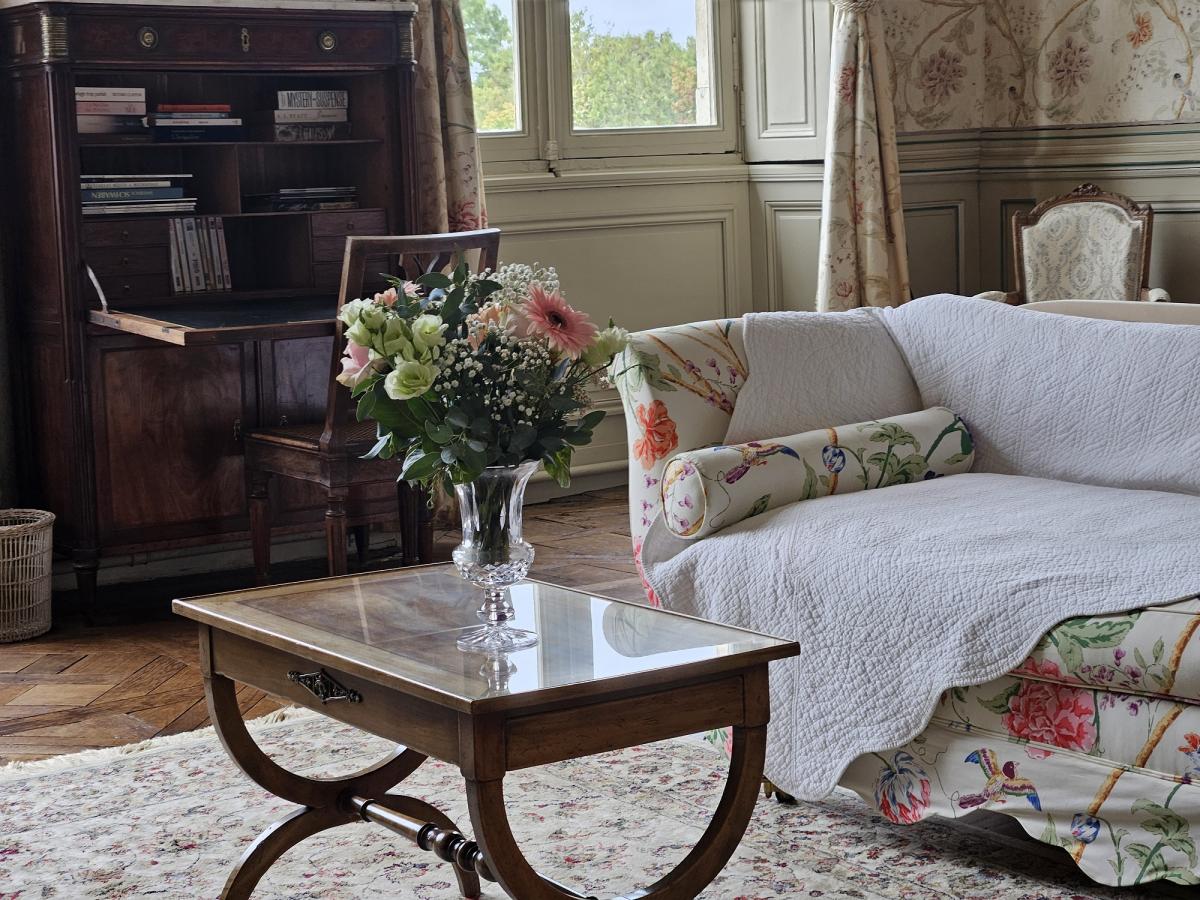 La chambre perruches tire son nom de son tissus ornée de charmants oiseaux et de fleurs. Le lit de 160cm est encastré dans une alcôve. Elle donne sur le grand perron de l'arrivée et offre une belle perspective sur le parc à l'anglaise. La salle de bain comporte une grande baignoire à pieds de lion, lavabo et toilettes. Elle forme une suite pour 3 personnes avec la chambre Empire.