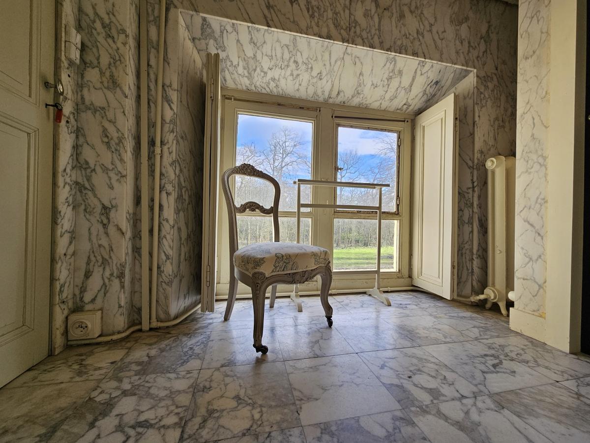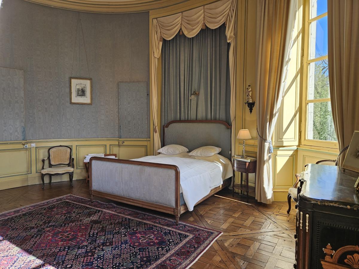 La Chambre Ovale est l'ancienne chambre de la Marquise de Champagné. Elle tient son charme grâce à sa forme rigoureusement ovale qui épouse les rondeurs de la façade sud du château. vue sur le jardin à la française.