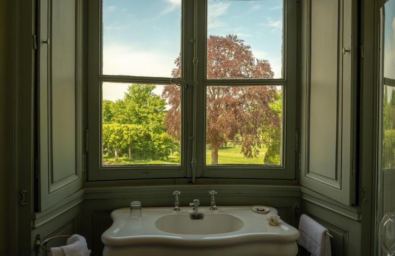 Salle de bain avec douche et toilette, belle vasque ancienne avec vue sur le jardin à la française;