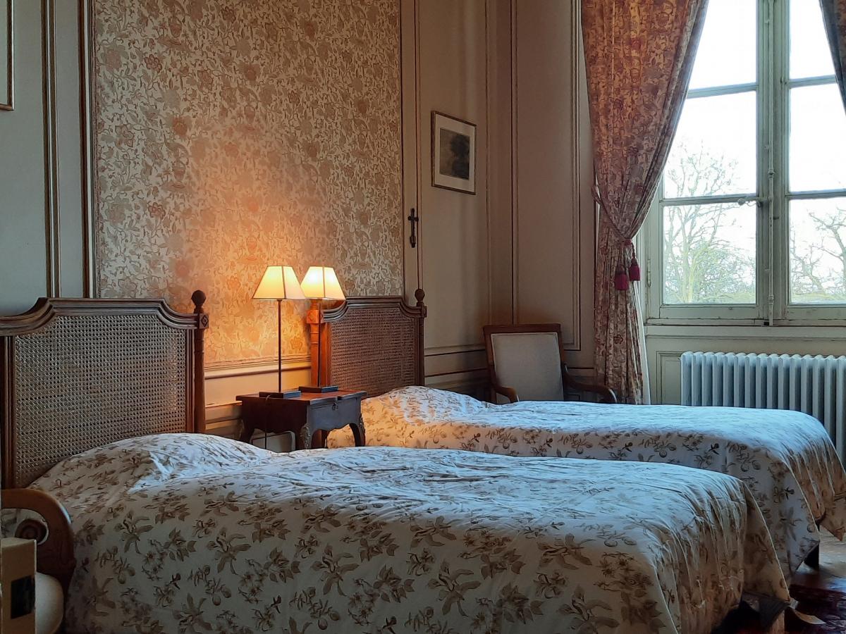 Cette jolie chambre aux tons doux, beige et rouge, avec ses 2 jolis lits en bois de style Louis XVI, ouvre sur l'ancien pigeonnier du château ainsi que sur une partie du jardin à la française.