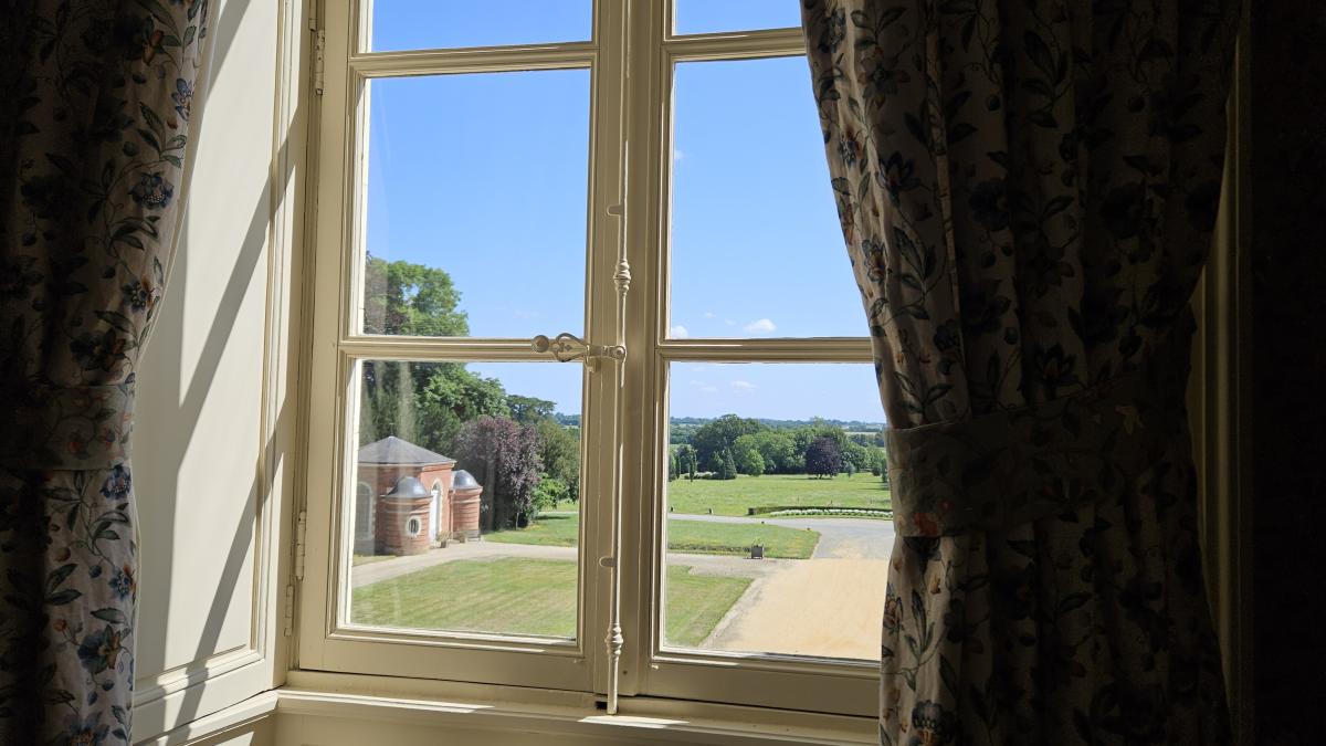 Vue sur le perron du château sur le parc à l'anglaise et la campagne