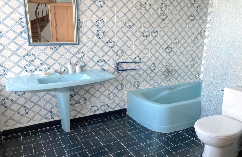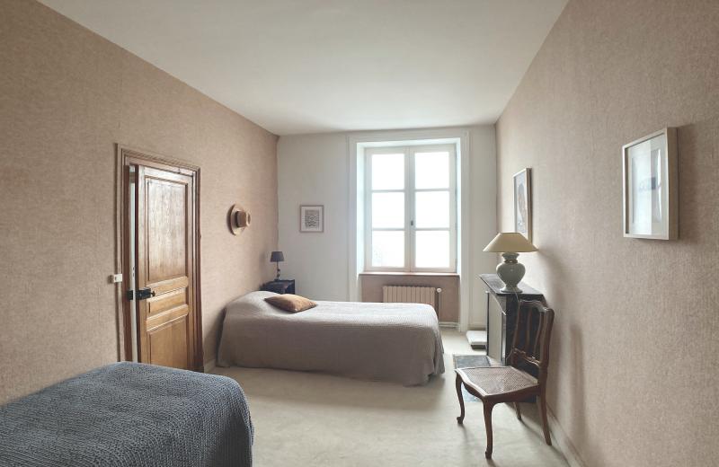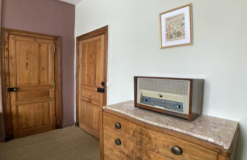 Elle est équipée de deux lits une place (90x200cm) + porte manteaux et commode. SDB et WC seventies sur le palier à coté de la chambre avec douche/baignoire.