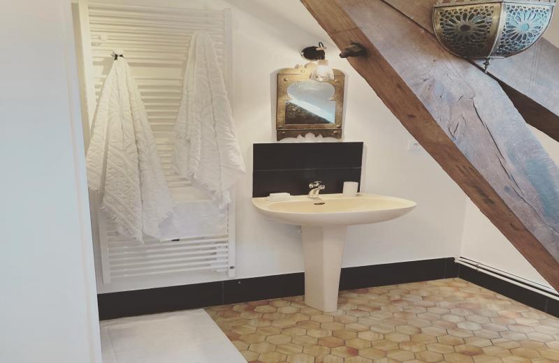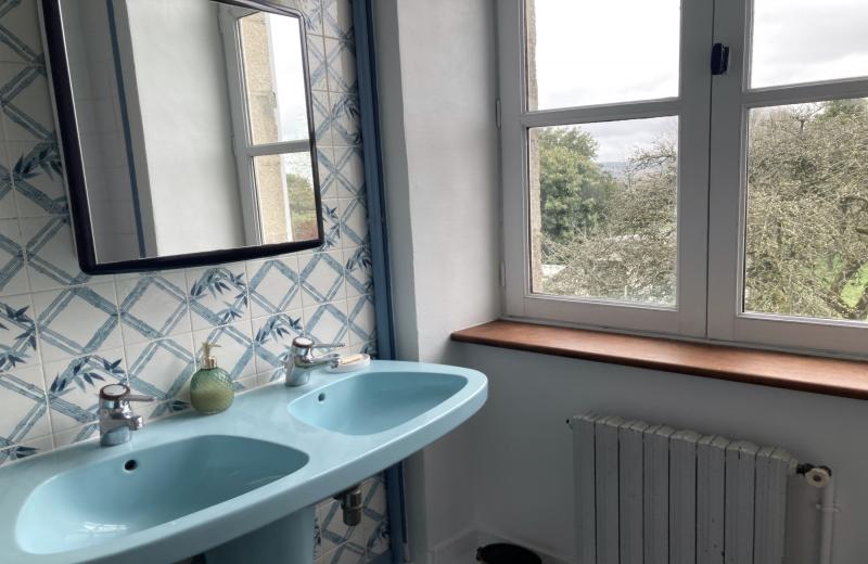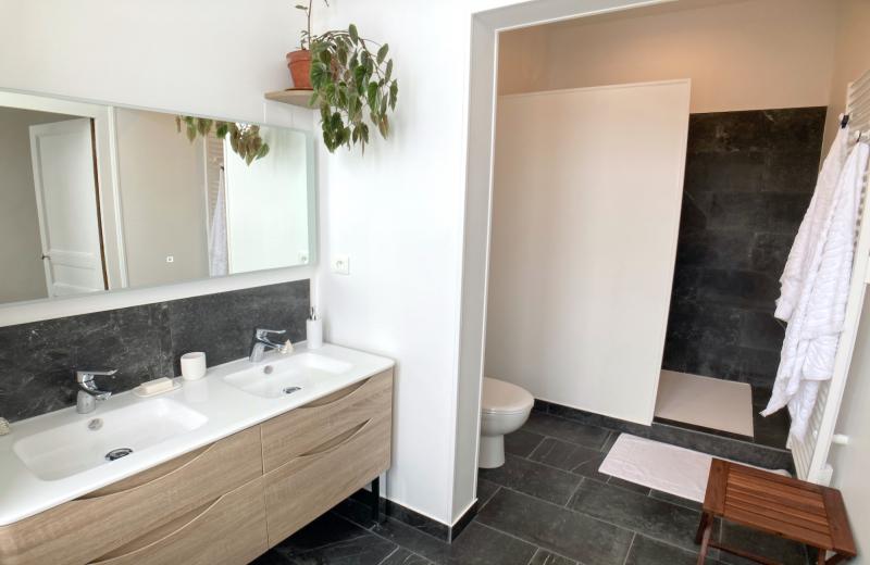 La chambre parentale comprend un lit double King Size, avec surmatelas ; La chambre pour enfant est idéale pour 2 enfants (2 lits, mais les bébés ne sont pas acceptés). Dans le vestibule reliant les chambres : WC privatifs, SDB privative rétro, avec double vasque et douche avec vue sur les arbres