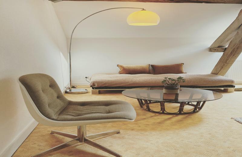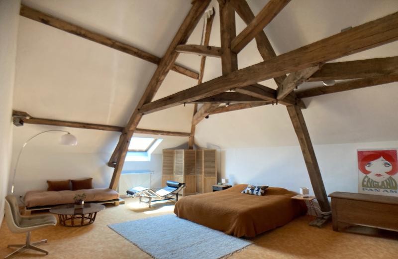 Très grande chambre de 35m2 sous charpente (5,5m de haut), beaucoup de charme dans cet espace design à la décoration "She-Bam, Pow, Blop, Wizz !", avec chaise longue charlotte perriand, un espace salon où objets seventies cohabitent avec une modernité bienvenue.
